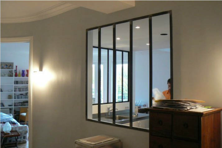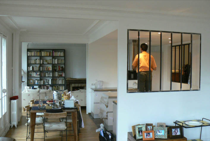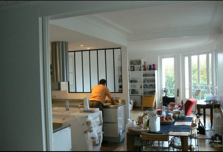La façon d’habiter a changé à travers les âges, et les appartements haussmanniens se retrouvent inappropriés aux modes de vie contemporains. Ainsi la cuisine devient partie intégrante de l’espace de vie, et espace d’échange entre les individus d’une même famille. Les lieux communs (cuisine, séjour et salle de télévision) sont donc rassemblés en un même espace ouvert et convivial. Ce plateau peut cependant être compartimenté par des cloisons coulissantes en cas de besoin. Cela permet par ailleurs de retraduire le second salon en un espace modulaire et flexible : salon-bureau-chambre d’appoint-salle de jeux. Les espaces privés (chambre, WC et salle de bain) sont au contraire clairement délimités et renforcés par des protections phoniques. Un nouveau bloc salle de bain et WC est aussi crée.