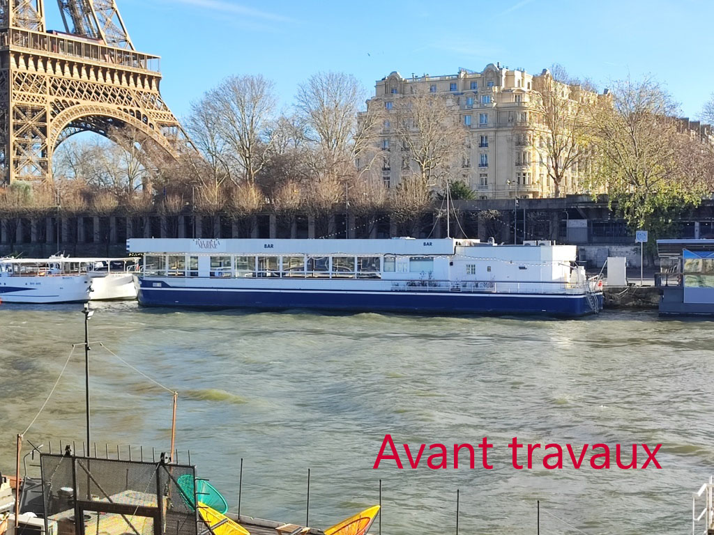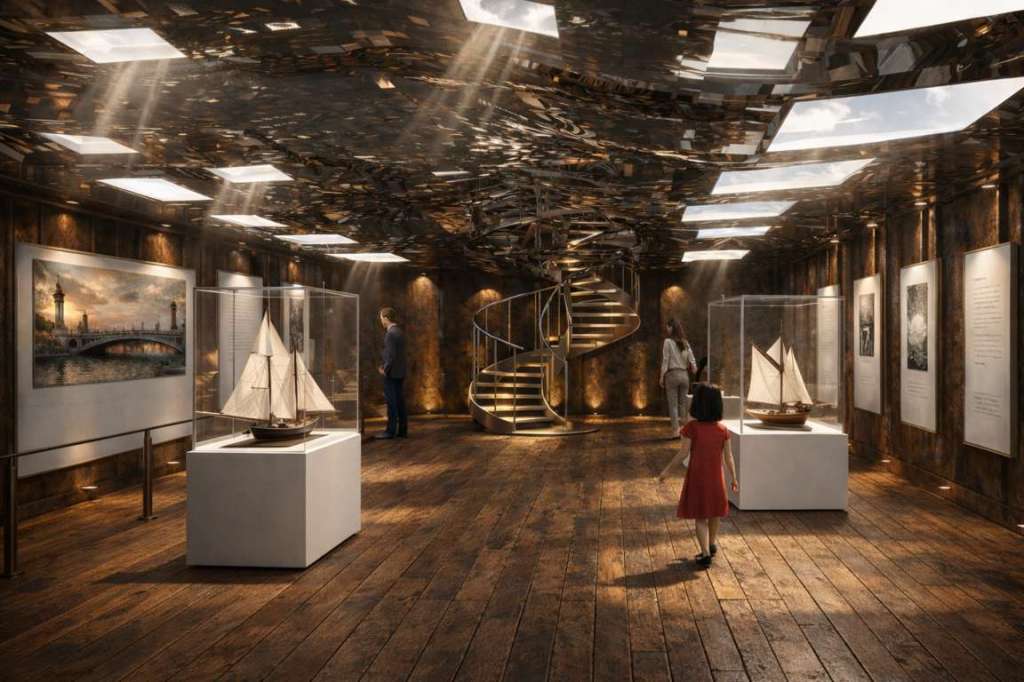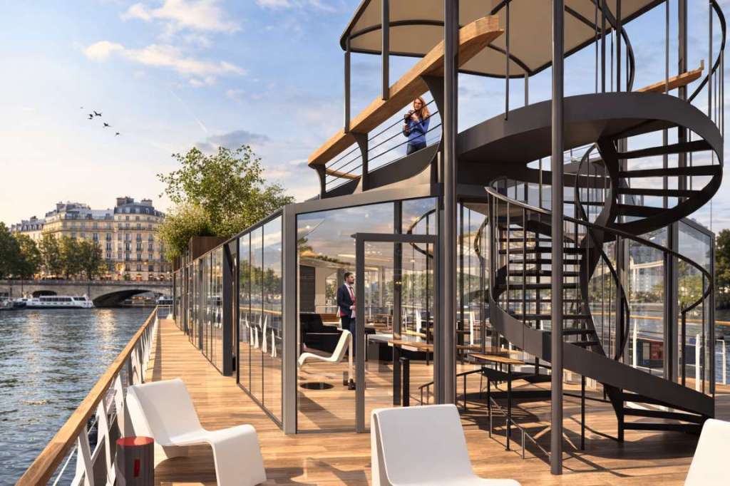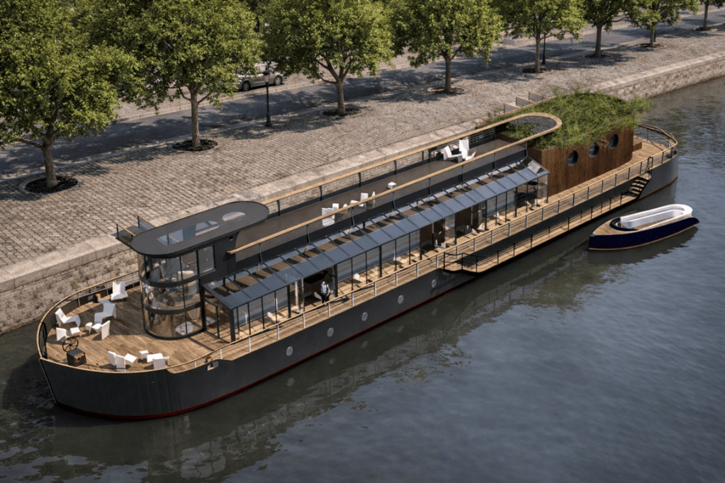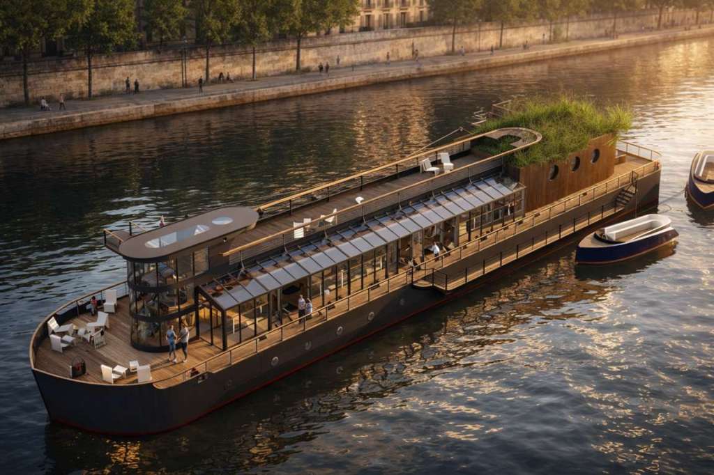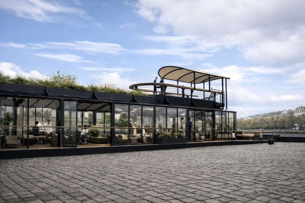 Projet de transformation de l’établissement flottant Le Cercle de la mer, à Paris. Le projet s’articule autour d’un ponton métallique abritant une ancienne coque en acier riveté, aujourd’hui révélée et mise en valeur au cœur de la soute. Le pont principal est repensé afin de gagner en légèreté et en transparence, offrant de nouvelles perspectives sur la structure existante. Les volumes créés s’inspirent de l’imaginaire des navires marchands, réinterprété dans une écriture contemporaine. Une plateforme suspendue, ancrée à la coque, permet l’amarrage de petites embarcations de plaisance.