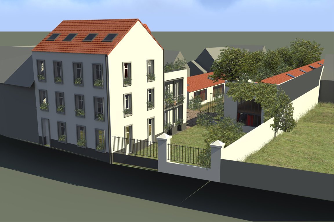 L’immeuble sur rue est ravalé, et ses proportions sauvegardées. Des fenêtres seront crées sur le mur pignon pour recréer une continuité urbaine et estomper l’effet de mur aveugle. Une terrasse sera crée pour diminuer l’effet de hauteur de l’immeuble.